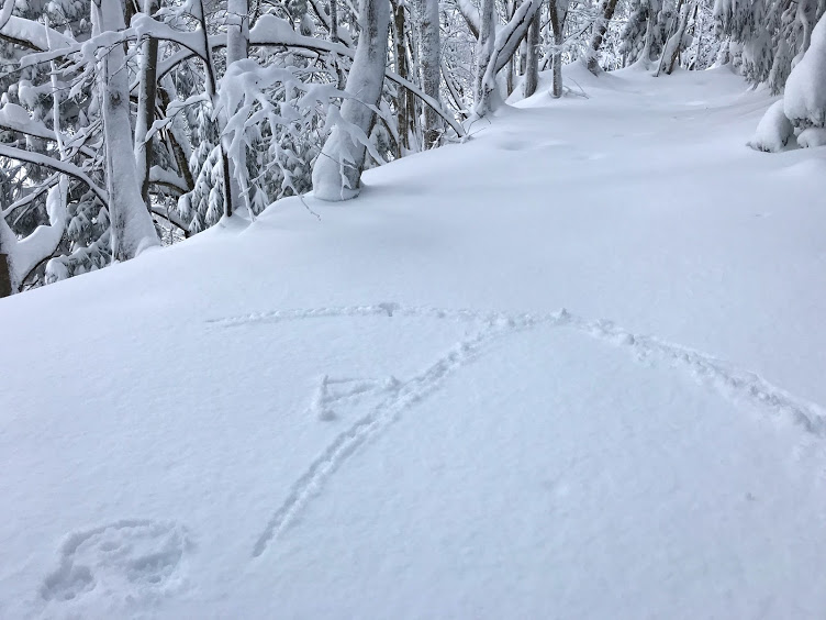- 途中バージンスノーに現在地を記しながら登る。特に意味はなし。