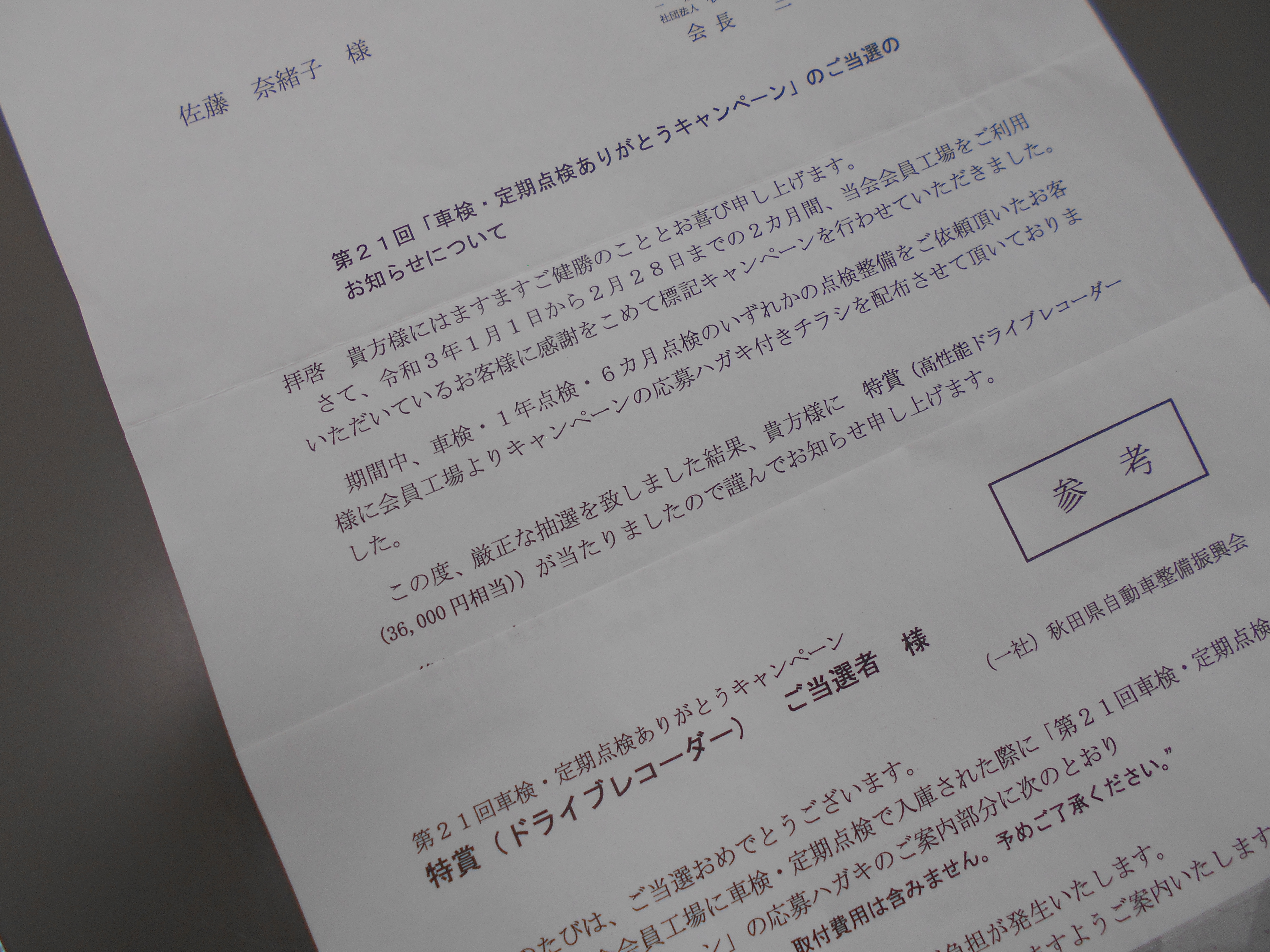 ある日帰宅すると、自動車整備振興会から郵便が届いていました。