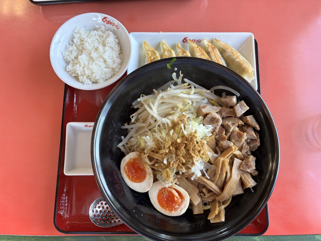 調子に乗って「油そば大盛と餃子・ライスセット」を注文してしまいました。