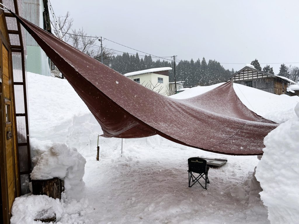 布を広げていくと、子どもたちの笑い声や、焚き火の匂い、夜の静けさがよみがえってきて、胸の奥がじんわり温かくなりました。ところが、広げた途端にアマ雪が降り始め、試しにこのまま耐雪試験をしてみようかとも思ったのですが、タープの雪下ろしどころか悲惨な光景が浮かんだので「これはまずいな」と慌てて撤収、今回はここまで・・・。
