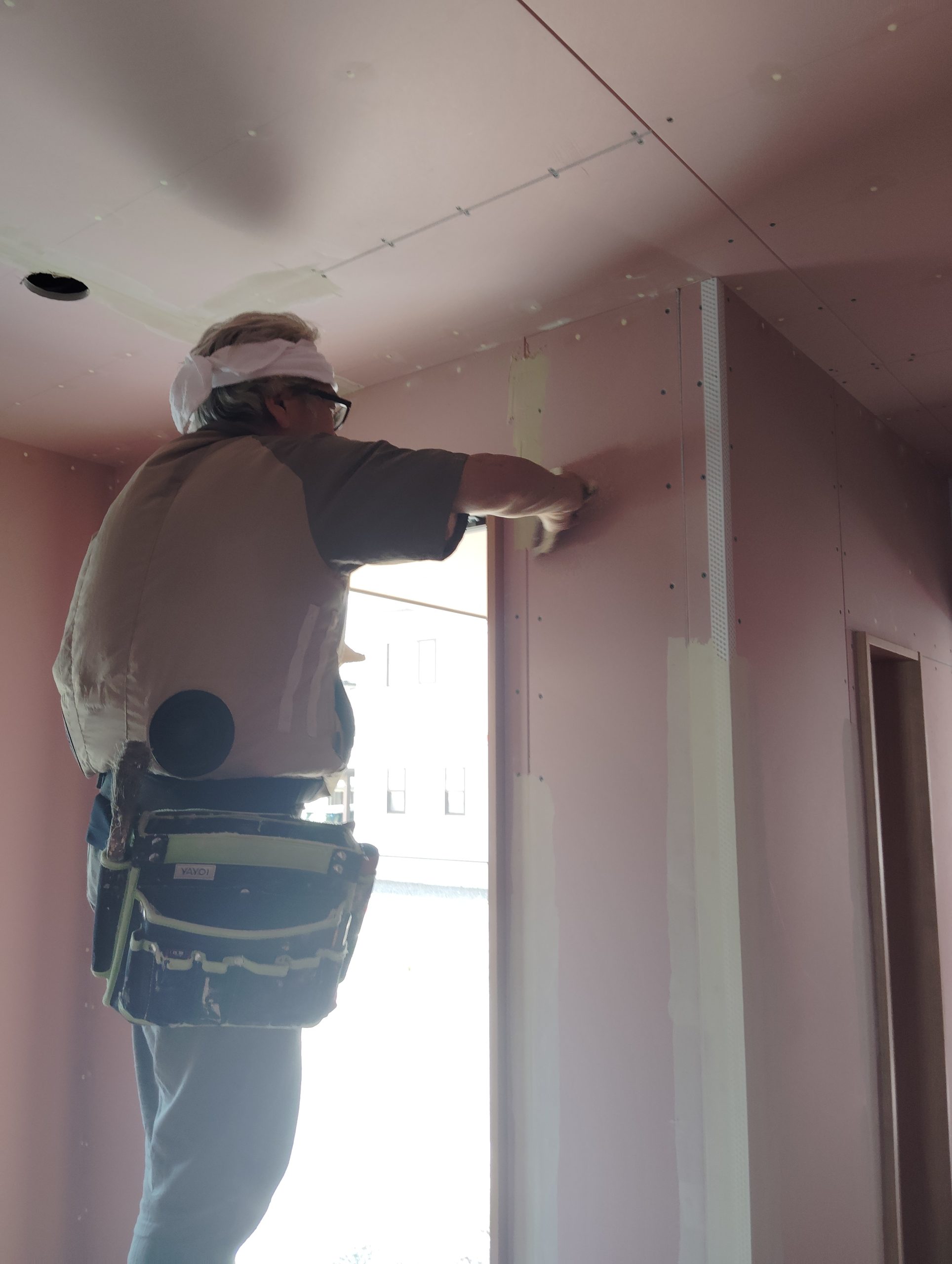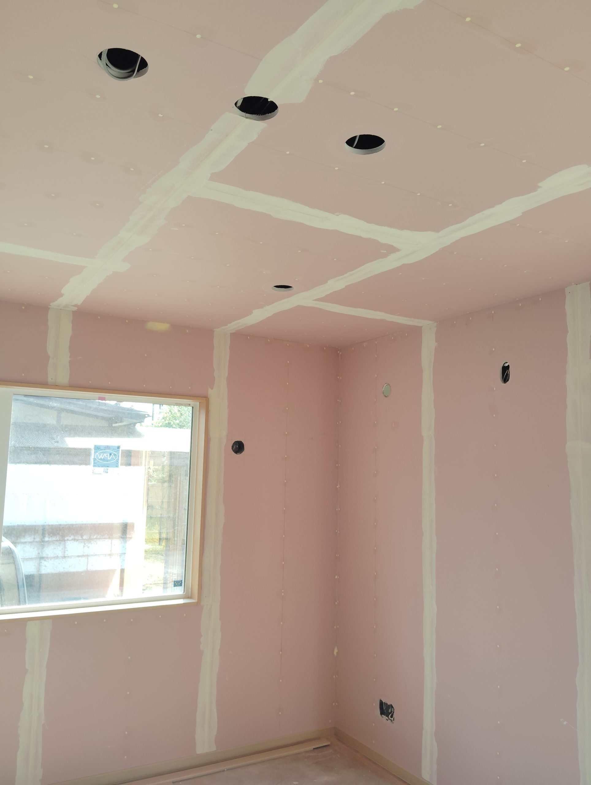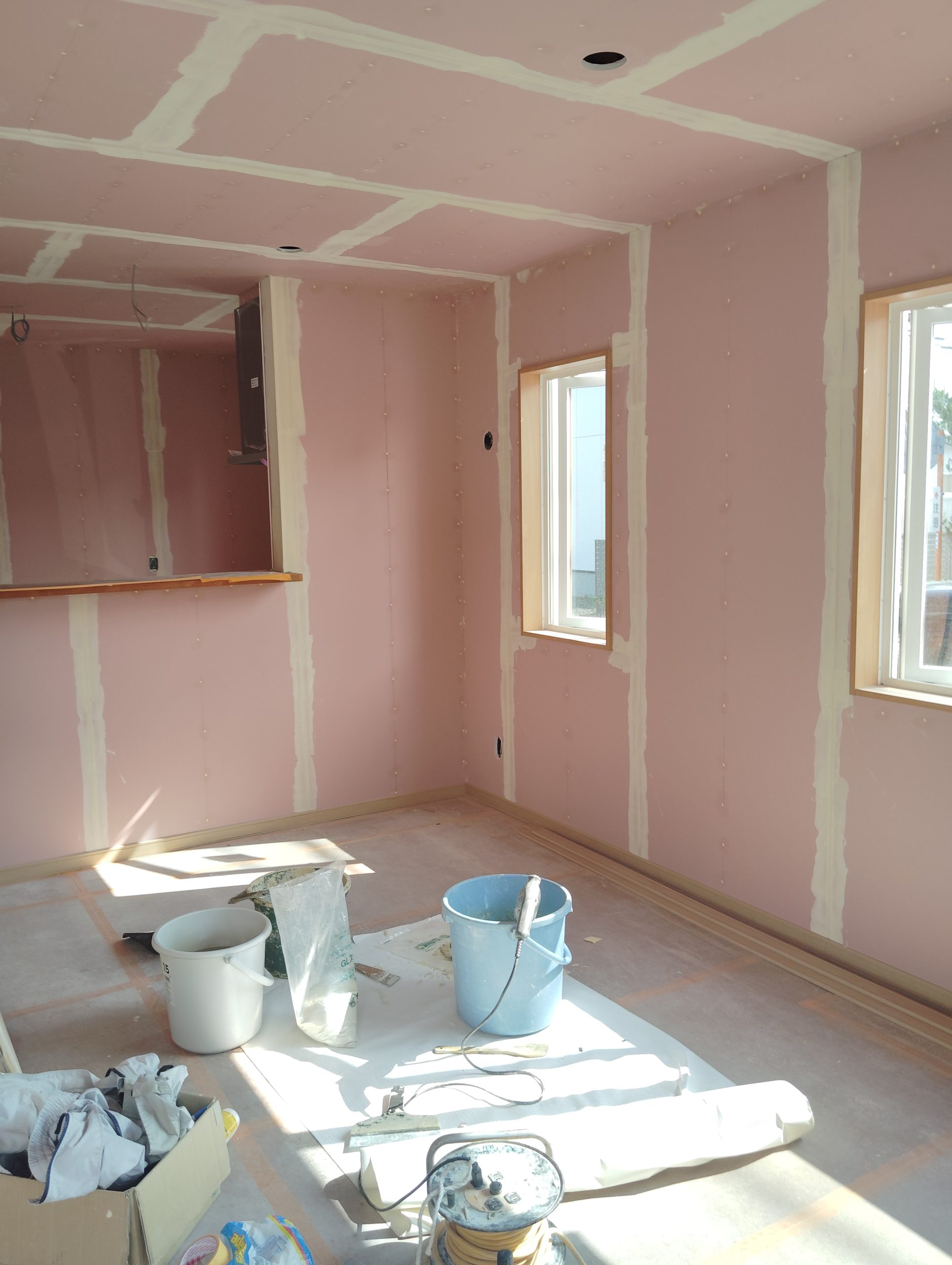 最初はハイクリンボードのジョイント部分やビスの頭部分の凹凸を解消するため、パテで均していきます。