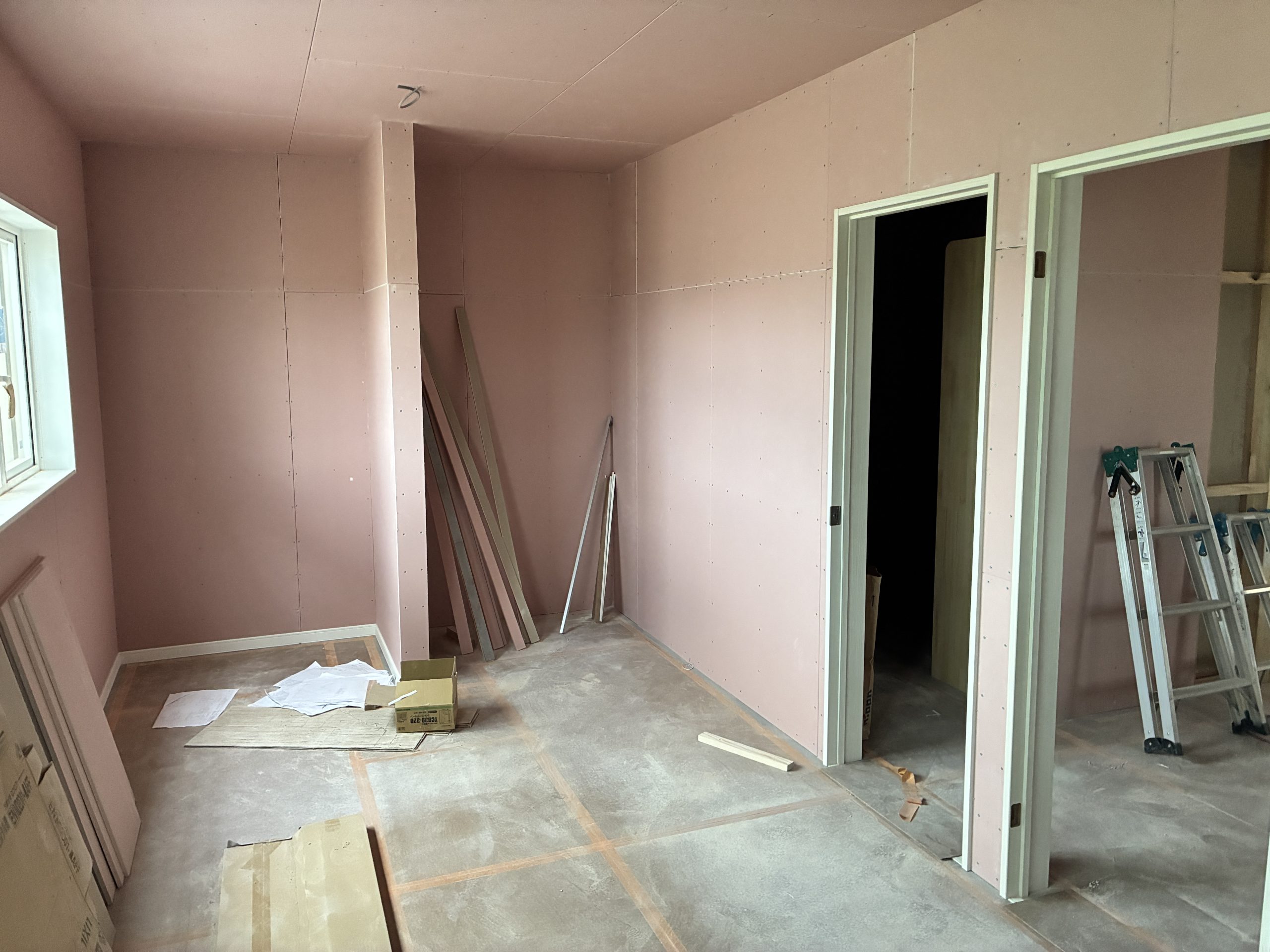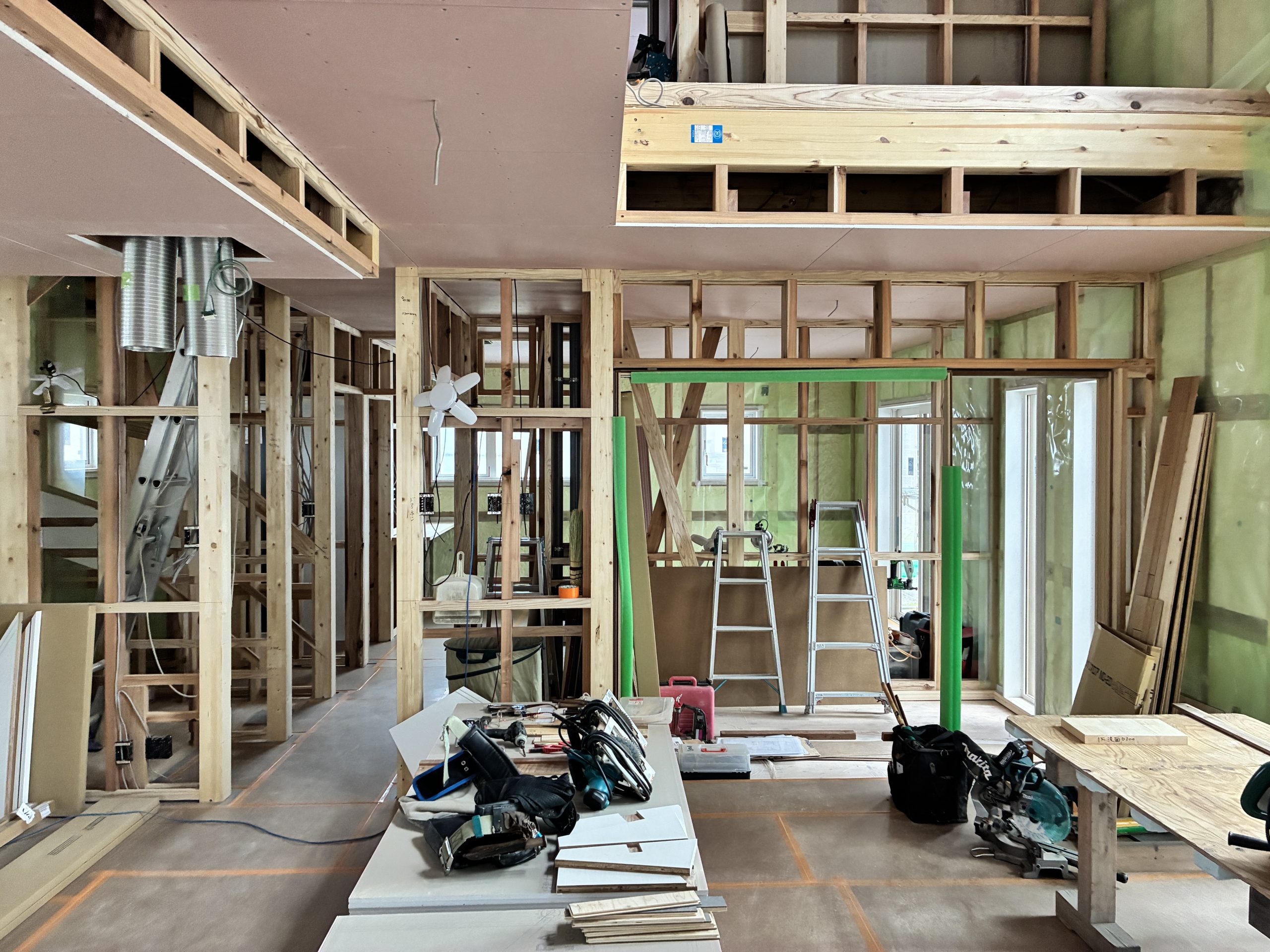 内部のフロア敷作業が完了し、ボード施工へ入りました。