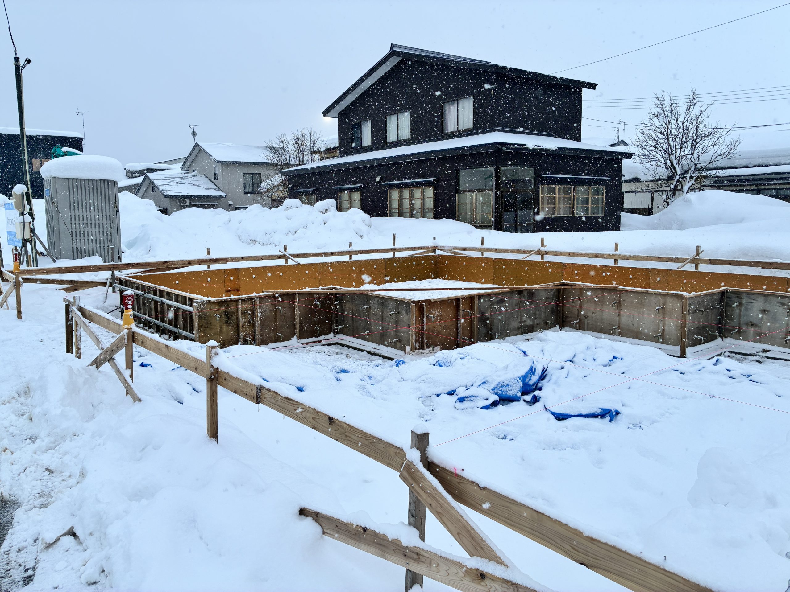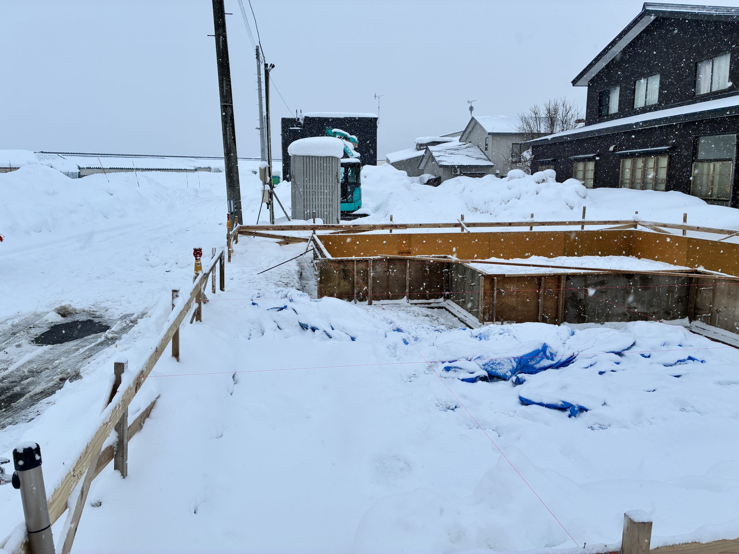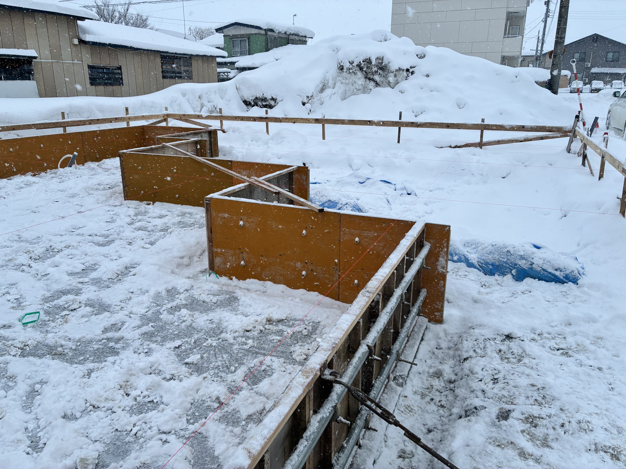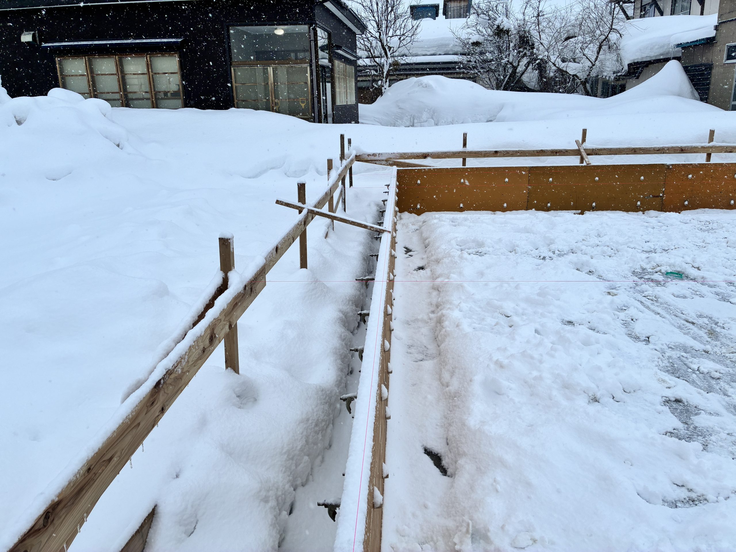 除排雪作業完了後に基礎の立ち上がりの枠付けを行いました。
