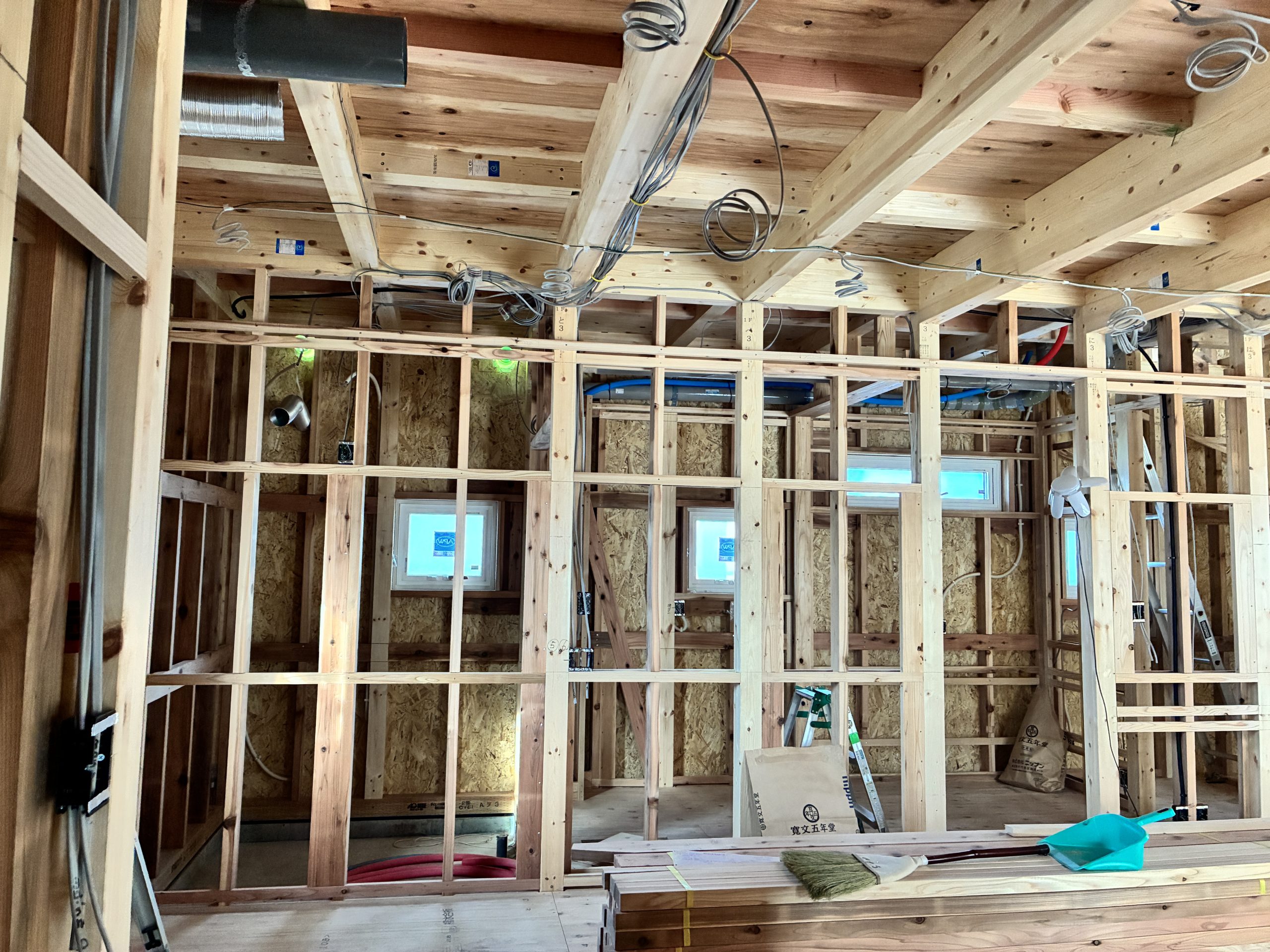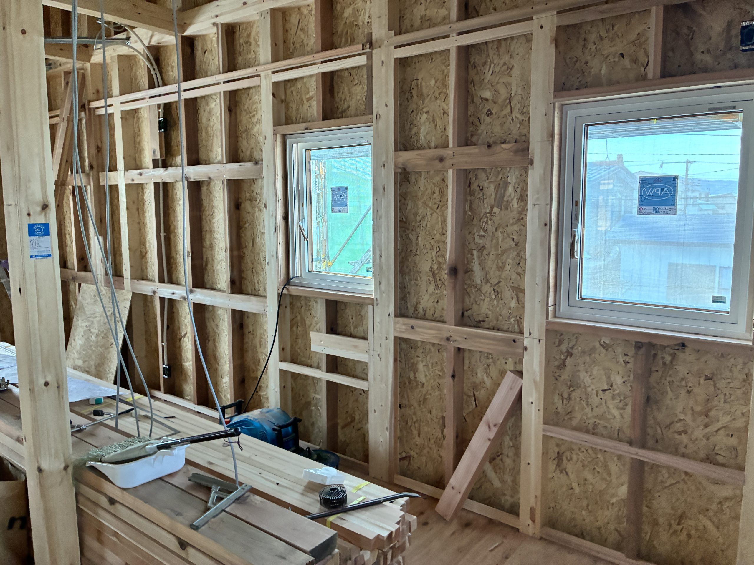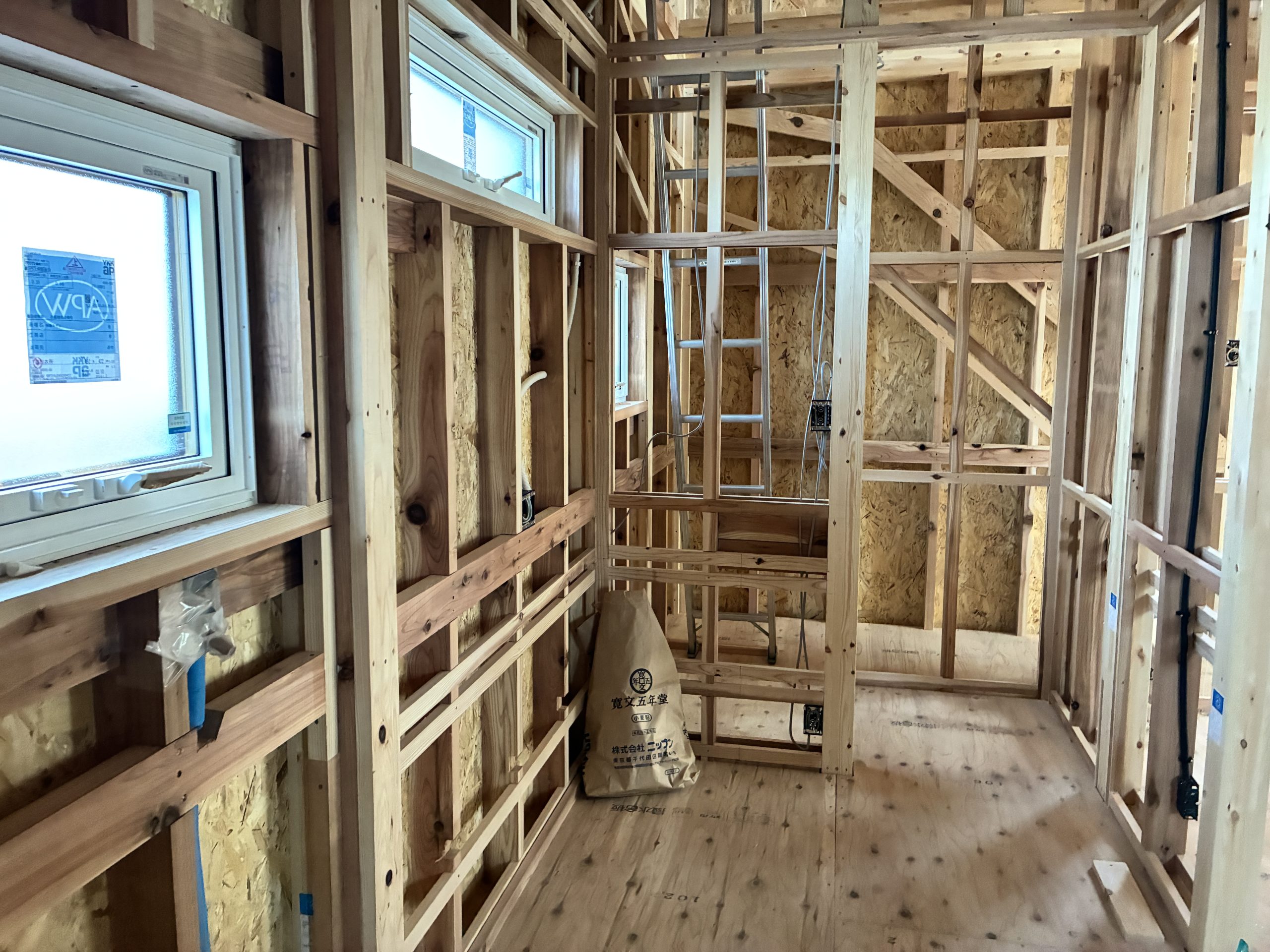 サッシの取付が完了し木工事が進んでいます。